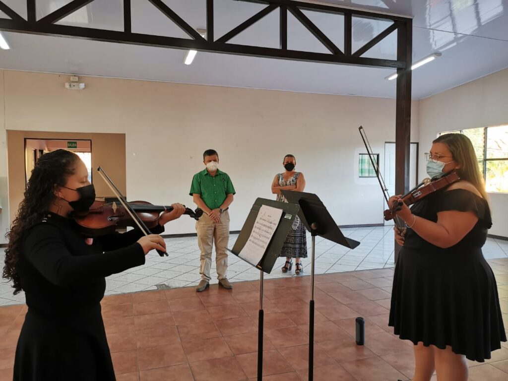 Como parte de la visita, la profesora María del Mar Piedra Arias, acompañada de la niña Isabela Calderón Rodríguez, tocaron dos piezas con violín, como una muestra de agradecimiento por la apertura del diputado a escuchar los desafíos del Sinem en este cantón josefino.