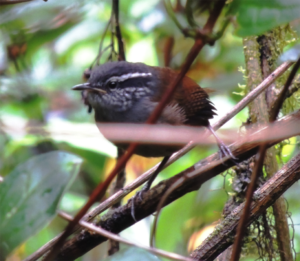 Dispuestos a conocer el emisor de esta destreza de cantos, nos quedamos quietos y evitando no hacer ruidos o ser vistos. Momentos después, la espera dio buen resultado, a través de la vegetación apareció por unos momentos con incesante carraspeo un ave pequeña; de color café marrón su espalda, alas y cola barreteada de negro, pecho gris, abdomen blanco opaco, cabeza y nuca negras, garganta blanca, una línea blanca sobre cada ojo, a manera de ceja, hasta el cuello. Sus patas largas con tres dedos al frente y uno hacia atrás, muy versátiles en el andar por la vegetación.