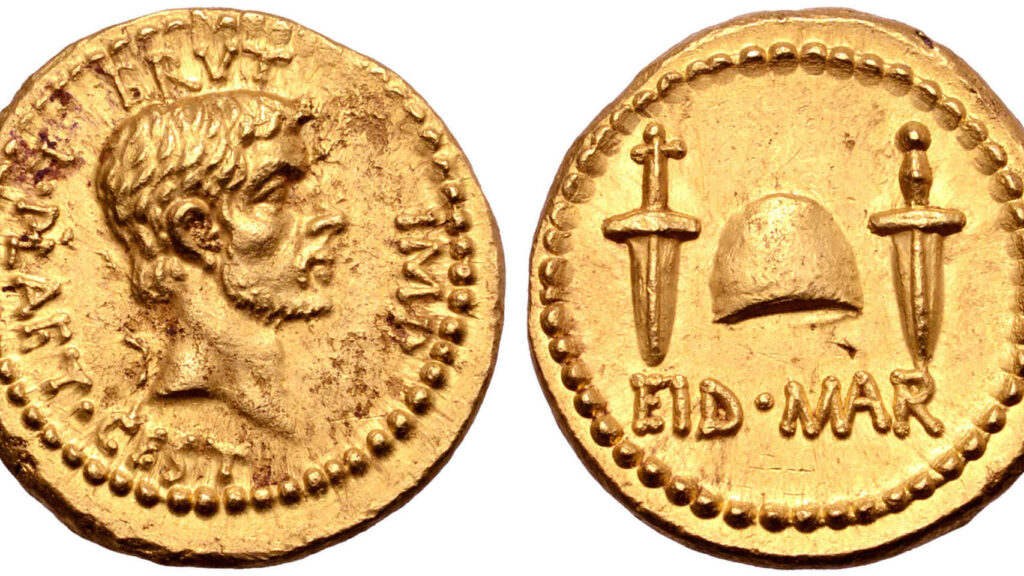 La moneda remite, también, al tiempo en que ocurrió el asesinato en los Idus de Marzo, de ahí la inscripción que reza: EID MAR. Julio César fue asesinado el 15 de marzo del año 44 antes de Cristo.