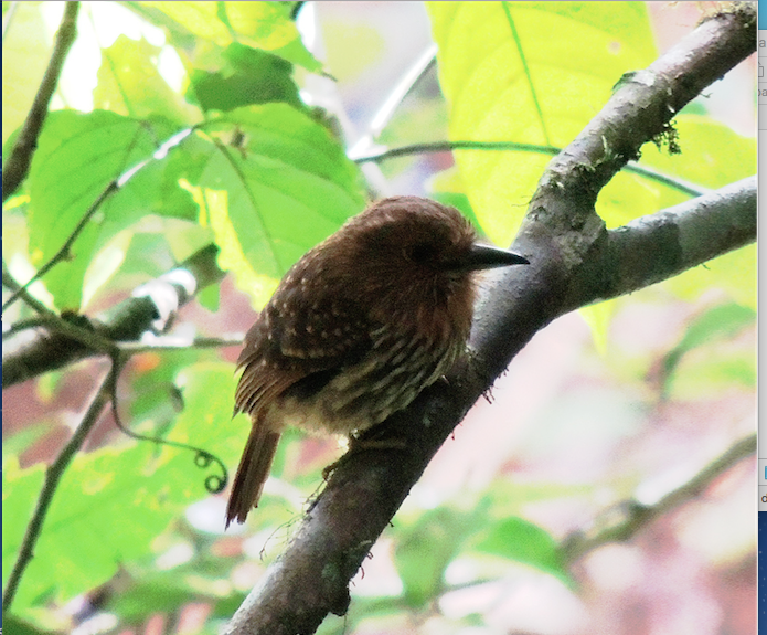 Entre el grupo de aves, con gran emoción, uno de los observadores nons indica de la presencia de un ave no observada en la zona de Acosta. Siguiendo sus indicaciones para ubicar su posición, logramos divisar sobre una ramita horizontal, de forma tímida, observando el paso de las hormigas.