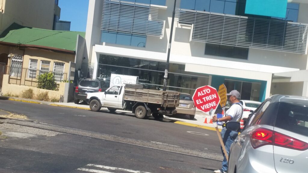 Costa Rica ha de ser de los pocos países en el mundo en los que todavía se avisa de forma manual y muy coloridad que viene el tren, y que por lo tanto todo el mundo debe despertarse.